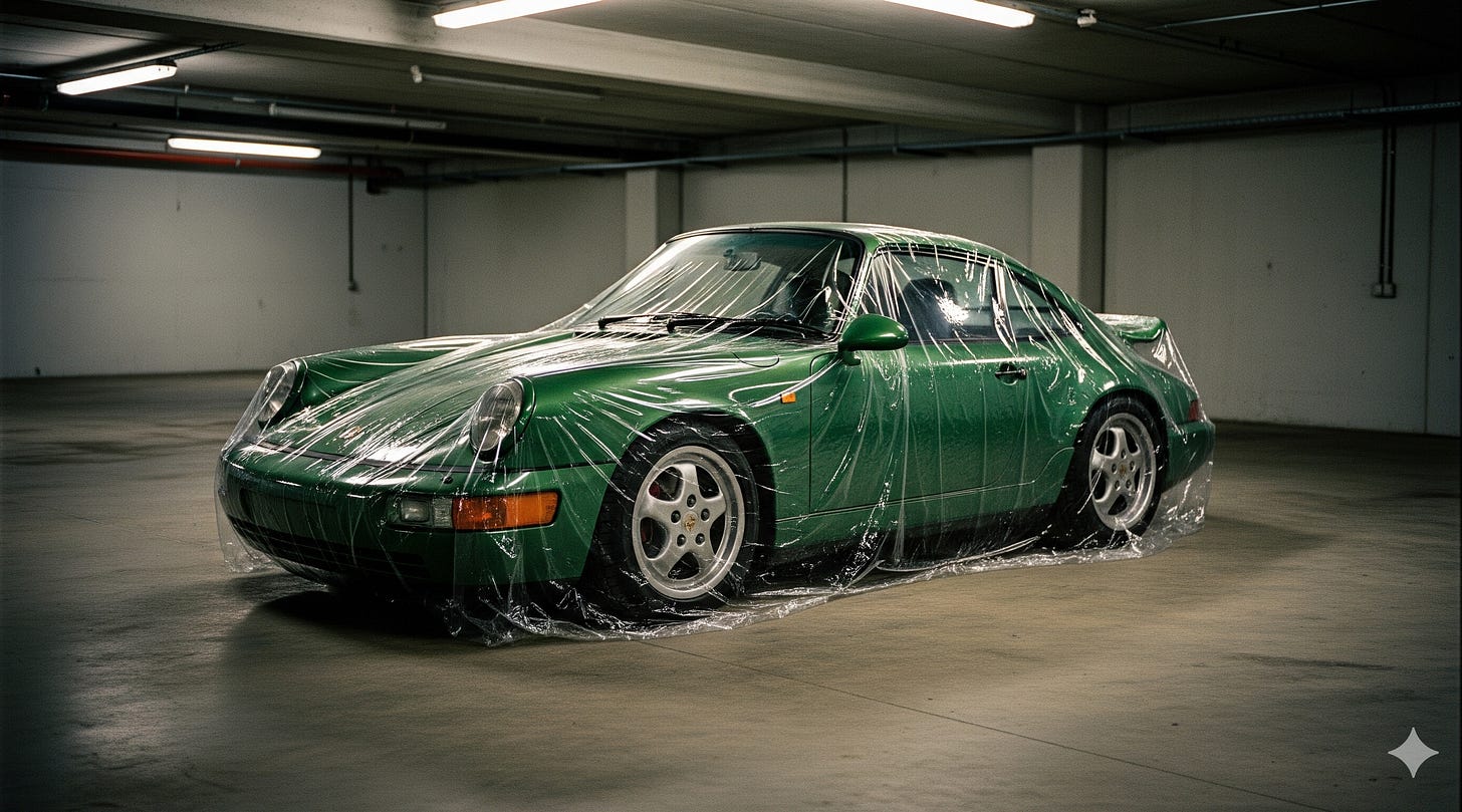 A 16:9 photograph of a vintage Porsche 911 wrapped tightly in clear plastic, parked inside a spacious empty garage under harsh overhead lights. The image looks like a hyper-realistic photograph, captured on a 1990s Nikon F4 film camera with flash. Glossy reflections on the plastic, concrete floor, moody industrial atmosphere, cinematic detail, accidental candid framing.