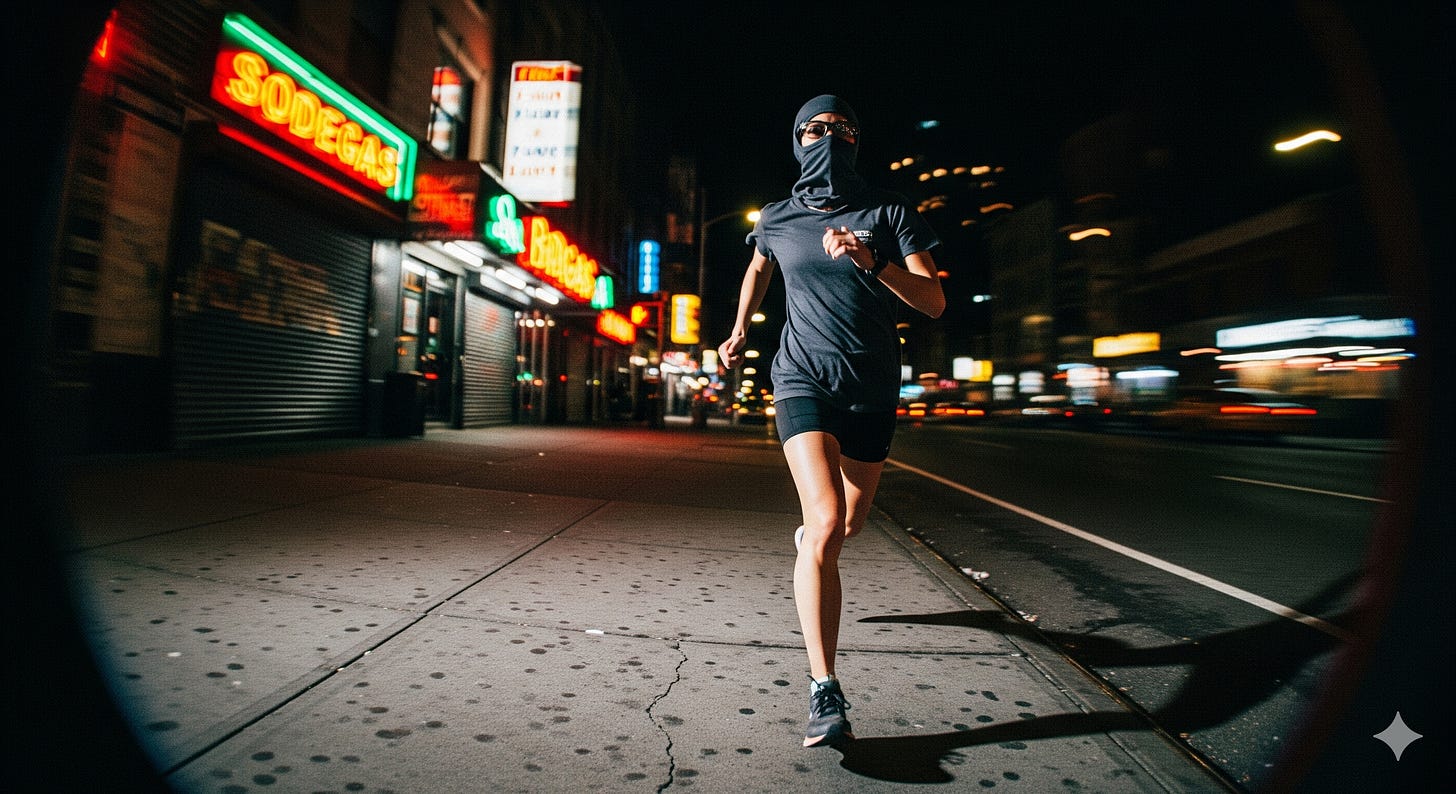 A 16:9 photograph, 1990s-style analog flash photo, female runner sprinting down a deserted new york street at night. she is wearing all black, has a t-shirt balaclava around her face, blank clothing, no text, she has dark sports glasses hiding her eyes. The perspective exaggerates her stride with fisheye distortion, camera tilted in a strong dutch angle. The photograph is hyper-realistic but grainy, evoking amateur night photography. Harsh flash casts sharp shadows on cracked pavement, neon signs blur in the periphery. Feels urgent, stolen, documentary-like, shot with a GoPro Hero.
