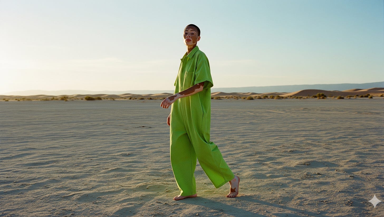 A 16:9 photograph of a unique featured, model with vitiligo skin stands in a vast desert, wearing an oversized neon green jumpsuit. The image looks like a hyper-realistic photograph, captured on a 1990s Nikon F4 film camera with flash. Dusty horizon, soft golden light, cinematic detail, accidental candid pose.
